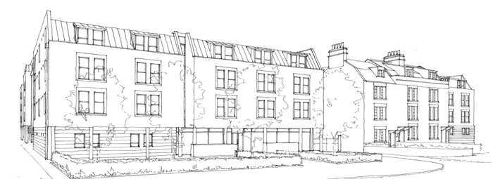 [29/3/08] The architects have submitted revised drawings. These reflect most of the details we discussed, and additionally, much of the rustication has been removed. It is not clear from the drawings whether our suggestion for a lighter grey window frame than was originally planned has been taken up, but colours, textures and finishes are normally agreed with council officers as conditions, so we can only hope that the final decision is for a colour that we are happy with.