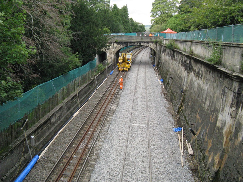 Network Rail kindly sent us a progress newsletter afterwards containing this picture of the "Up line" work completed. We are assured that the historic retaining wall to the right of the track in the picture has been thoroughly inspected and it was unaffected by the track bed work next to it.